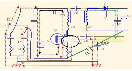 Mosfet/Diode到散熱片的雜散電容Cm/Cd;及散熱片到地的雜散電容Ce等途徑而耦合到LISN被取樣電阻所俘獲。